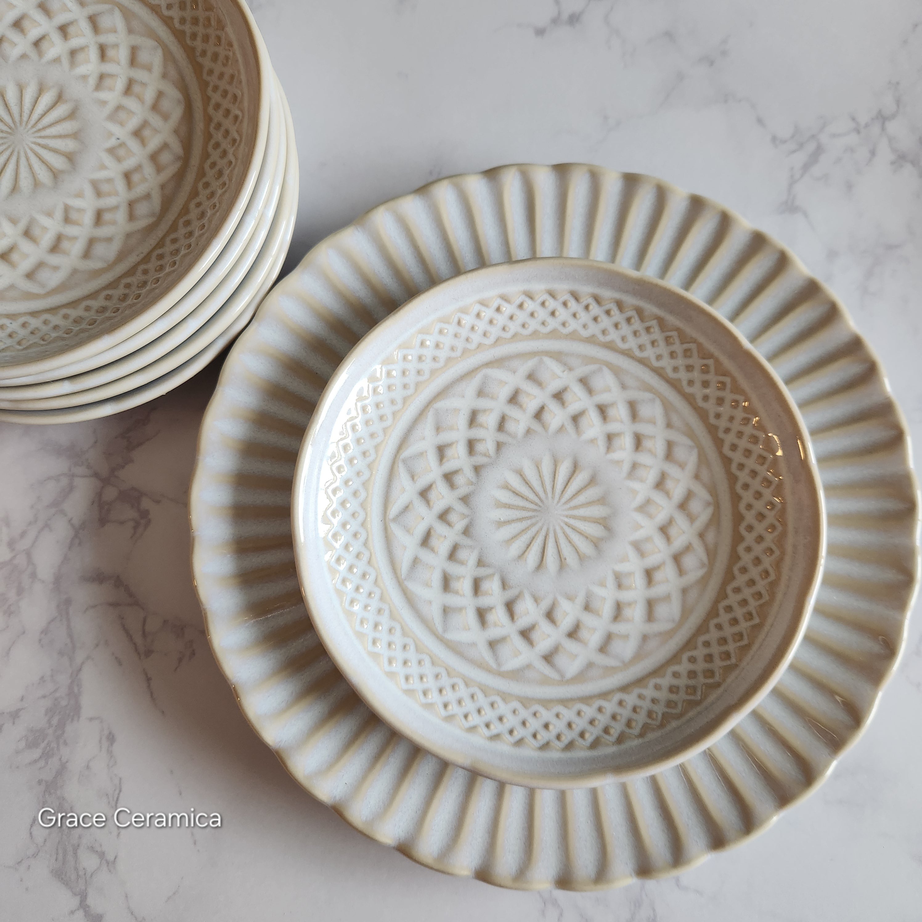 まるで古代ギリシアやヘレニズムを彷彿とさせるような特徴的なデザインは、 お皿の種類によってそれぞれ違ったモチーフを使ってデザインされているので、印象が違ってくるのも楽しい
