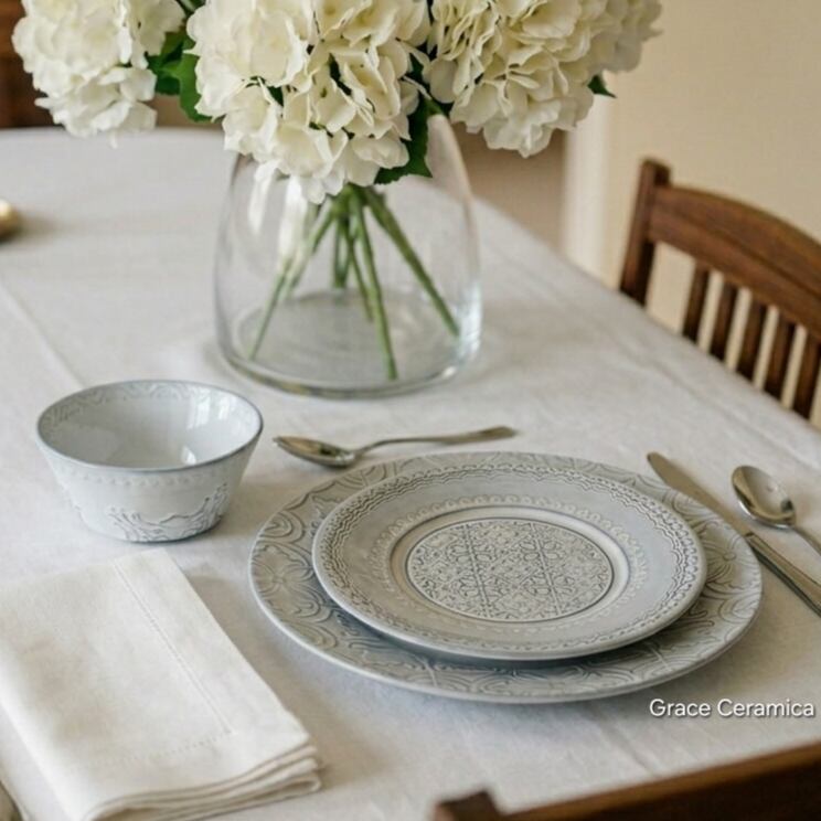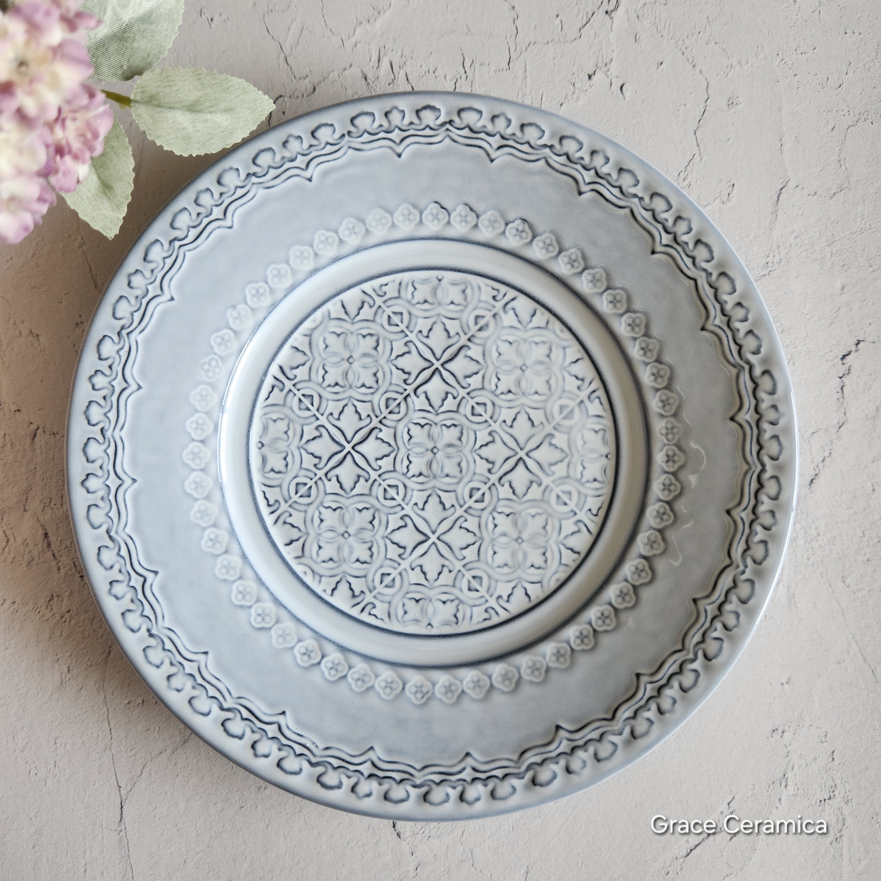 フルーツプレートは、朝食のパンやデザート、サラダの盛り付け、さらには食事の際の取り皿としても重宝します。一枚でも十分な存在感を放ちますが、ディナープレートと重ねて使うことで、繊細な浮き彫りが幾重にも重なり、食卓に圧倒的な奥行きと気品をもたらします。